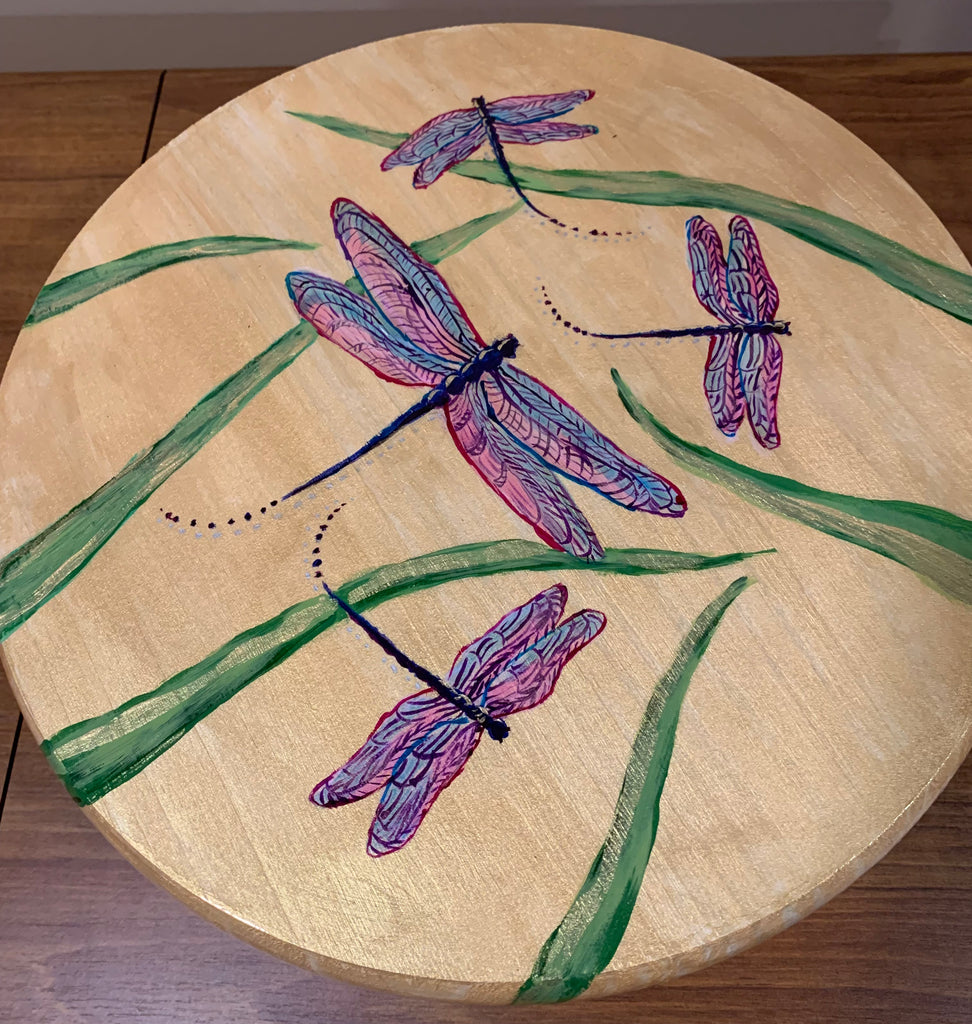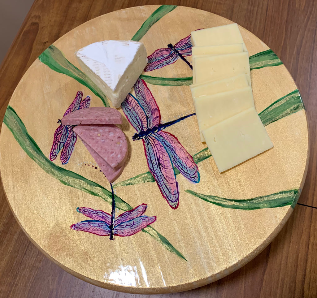 Round wood serving or charcuterie tray. Hand painted with dragonflies on gold background. The serving tray has been coated with at least 10 coats of food safe clear coat. It and has rubber feet on the back to protect your furniture.