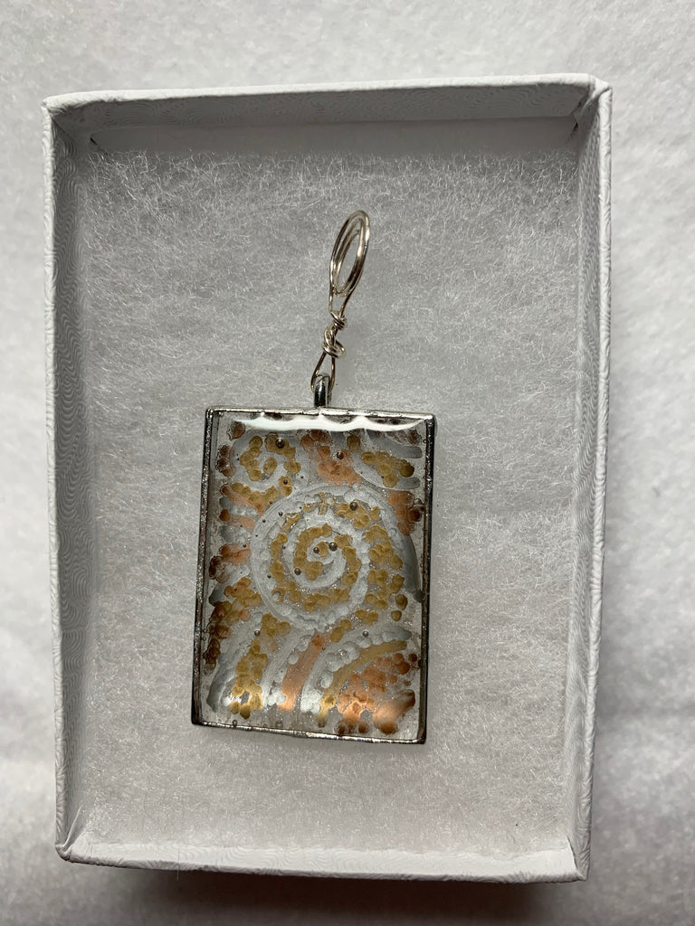 This pendent has a design of bronze and silver hand drawn swirls incased in tansparent resin.