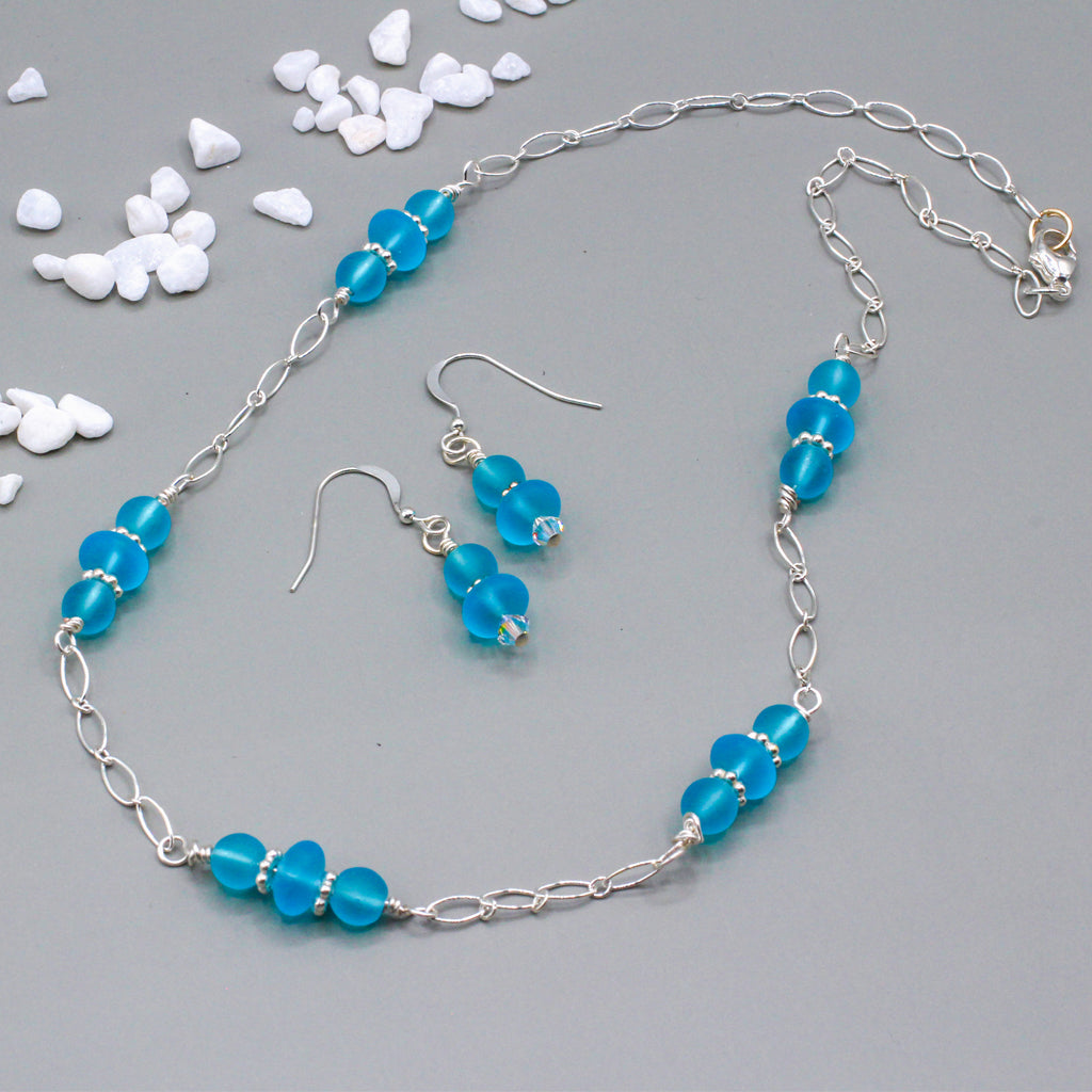 Sterling silver chain with aqua sea glass beads. Necklace length is 18” and will be packaged in a white jewelry box suitable for gift giving.