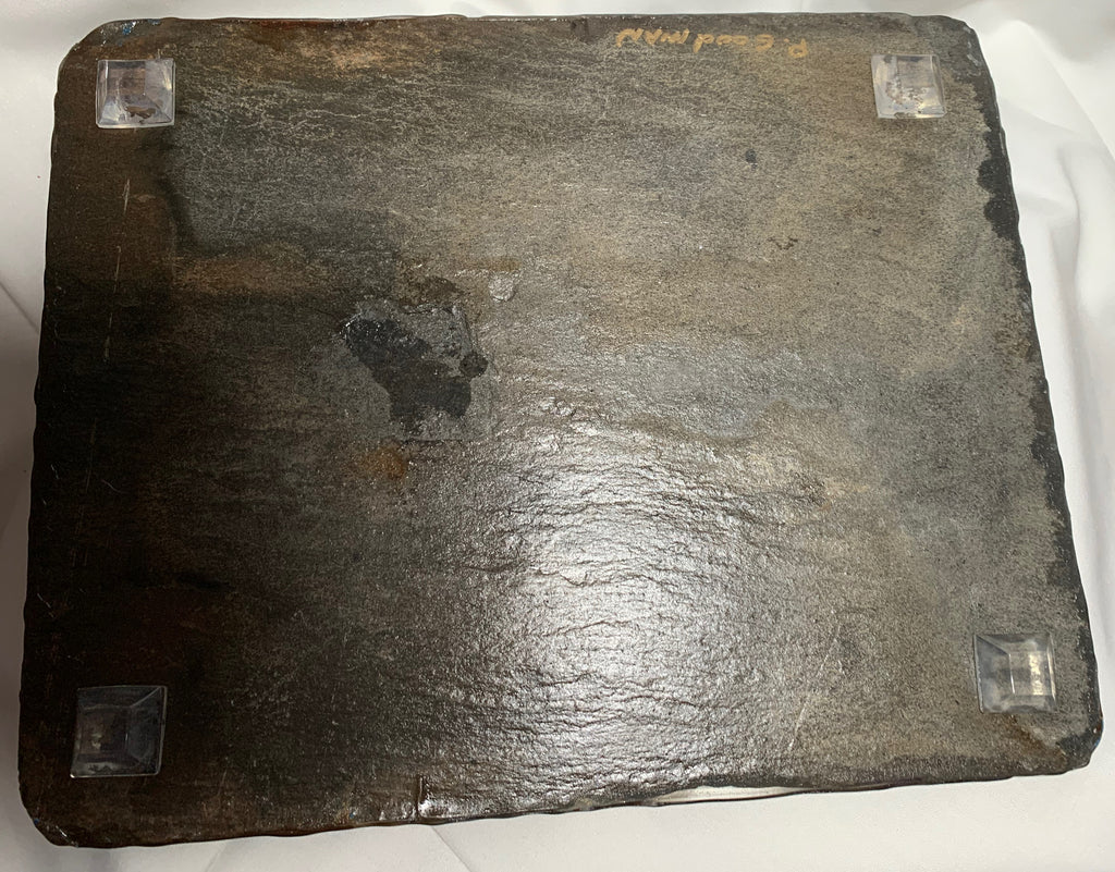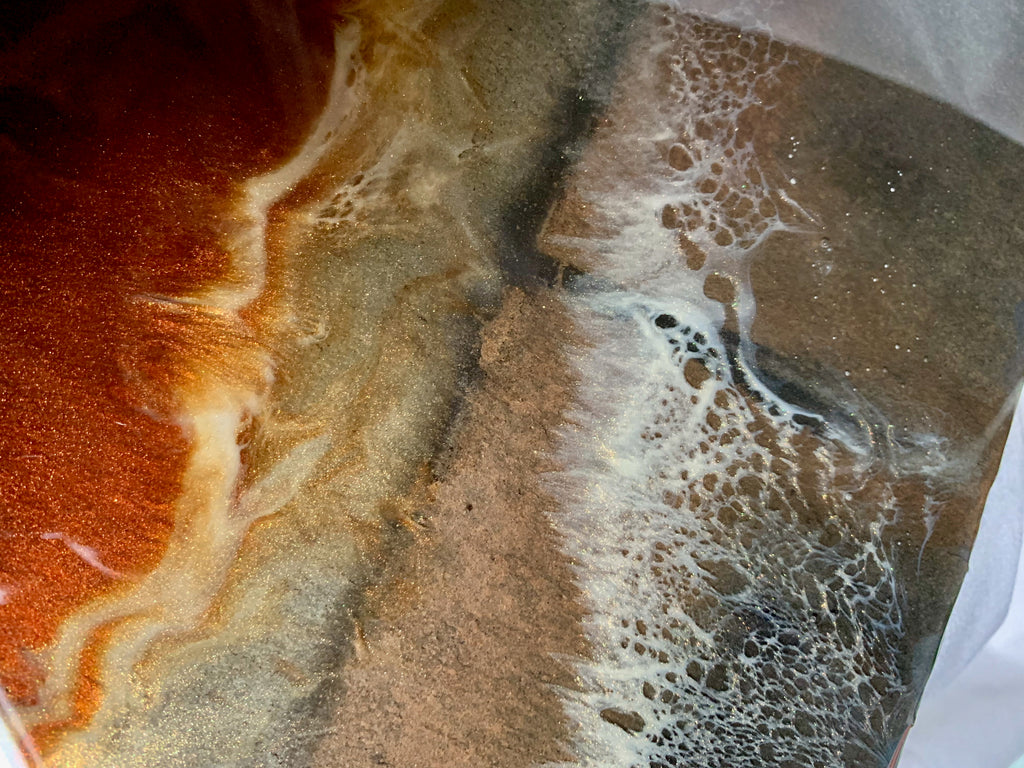 This cheese serving board is covered in iridescent bronze and gold resin on slate. Back has rubber bumpers to protect your furniture.