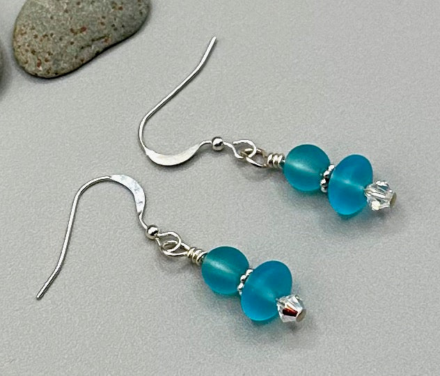 Sterling silver, aqua sea glass with Swarovski crystal earrings